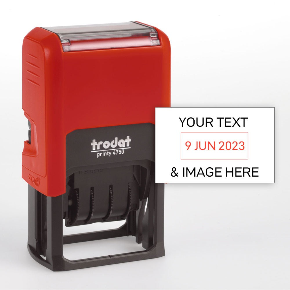 Trodat Customize Your Text with Date Stamp with Built-in Ink Pad (Blue & Red Ink) Make document processing fast and efficient with the Trodat Customizable Stamp. Featuring a durable red body and a built-in ink pad with blue and red ink, this self-inking stamp ensures crisp, smudge-free impressions every time.