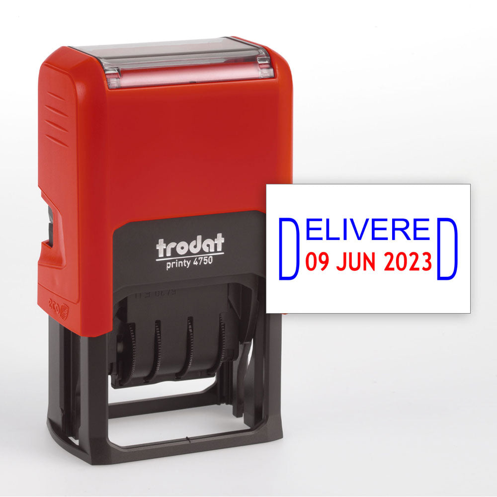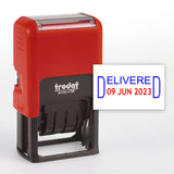 Trodat DELIVERED with DATE - Text Stamp with Built-in Ink Pad (Blue & Red Ink) Make document processing fast and efficient with the Trodat Stamp. Featuring a durable red body and a built-in ink pad with blue and red ink, this self-inking stamp ensures crisp, smudge-free impressions every time.